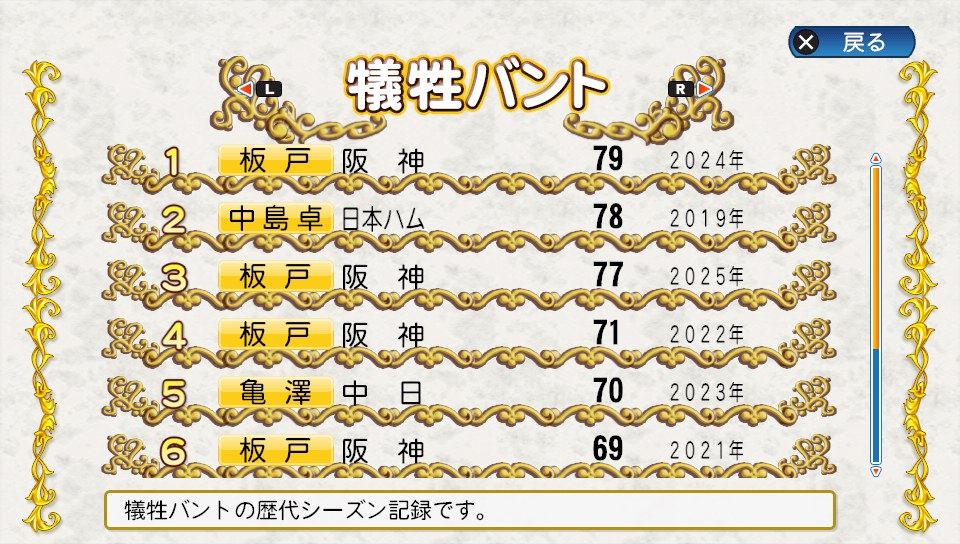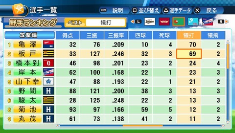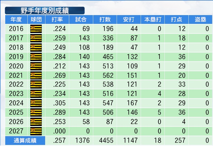 得点圏.256 三振121 四球29 死球3 犠打69 犠飛0 併殺5 出塁率.308 長打率.278 OPS.586