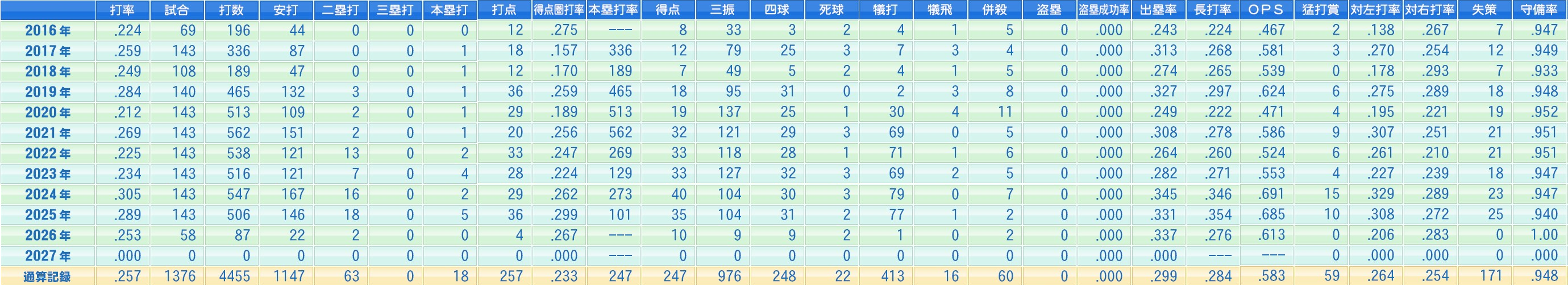 143試合 .269(562打数151安打) 2二塁打 0三塁打 1本塁打 20打点 0盗塁(.000)