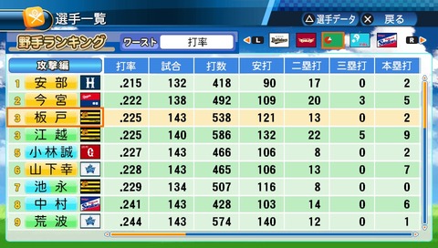 得点圏.157 三振79 四球25 死球3 犠打7 犠飛3 併殺4 出塁率.313 長打率.268 OPS.581