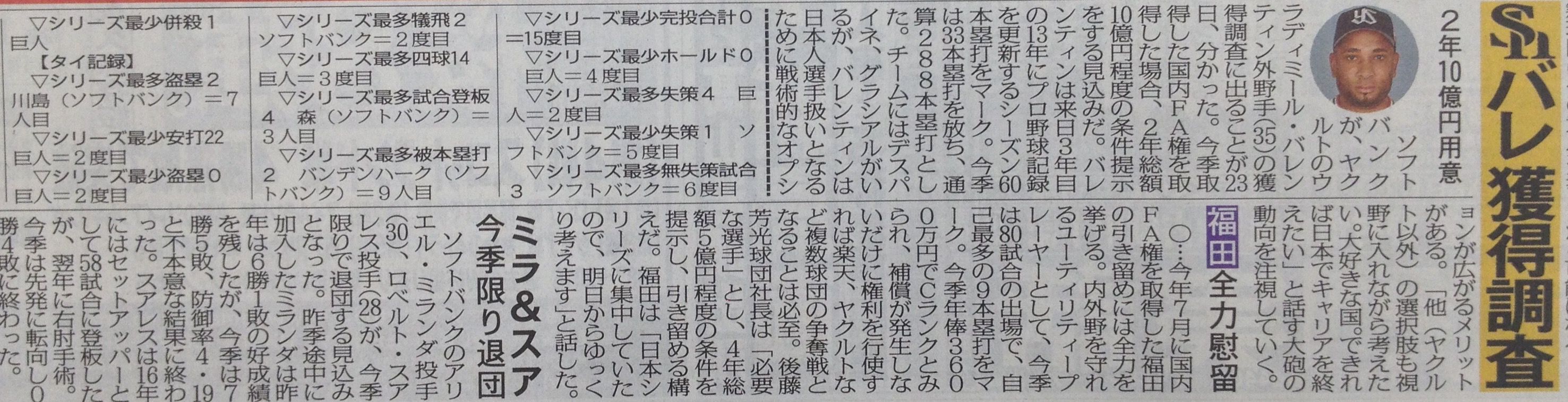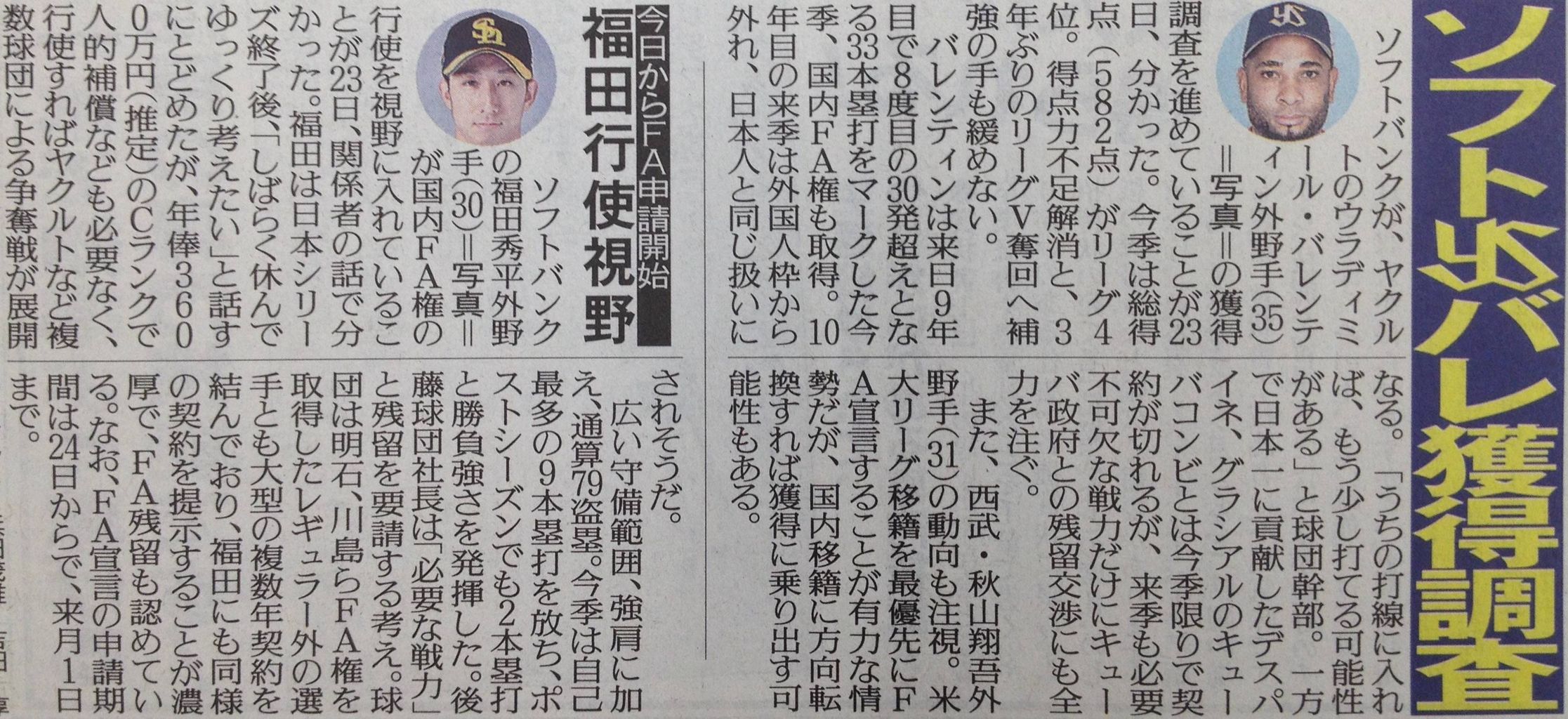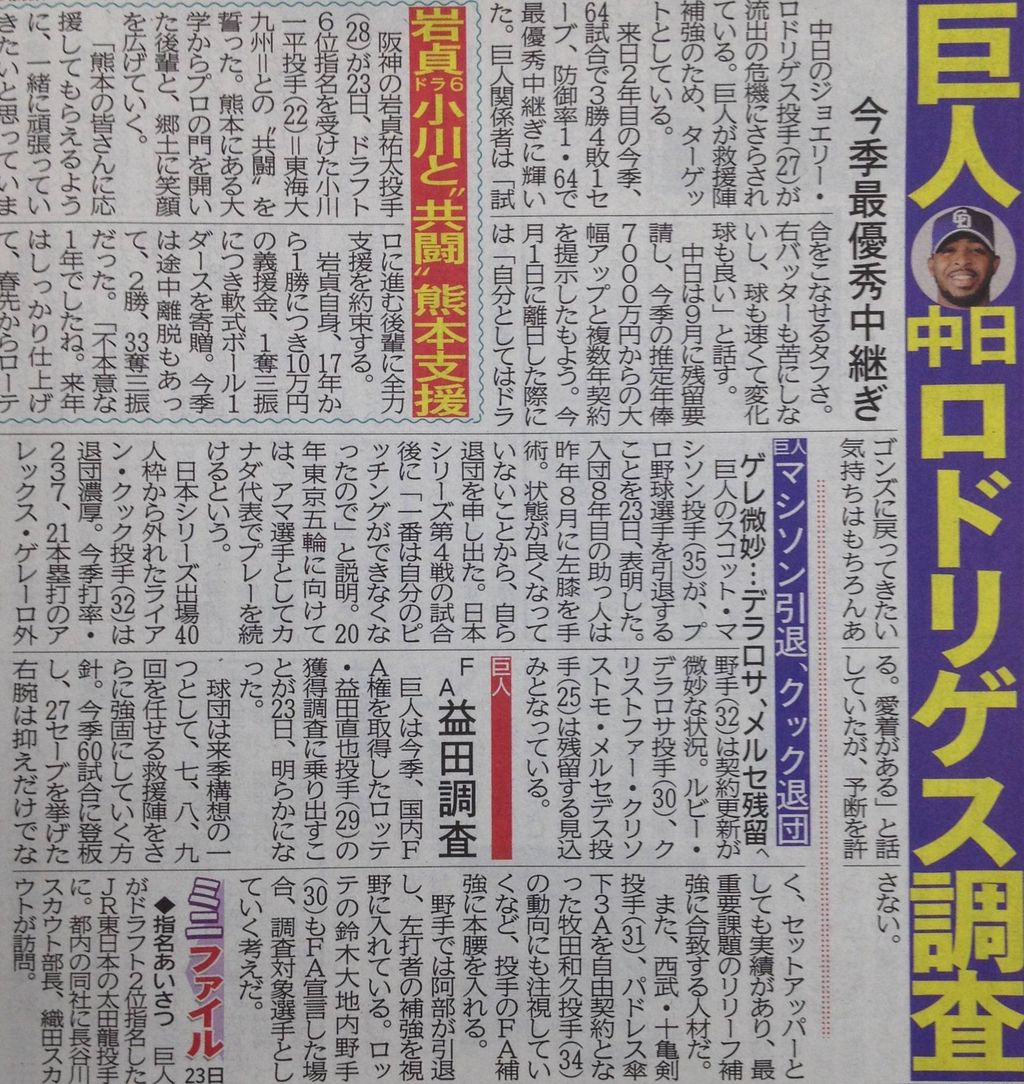 FA組では広島の野村祐輔投手(30)についても動向を注視。行使する場合は獲得に乗り出す可能性も含めて準備を進める。また、中日のジョエリー・ロドリゲス投手(27)が保留者選手名簿を外れた際には、獲得に乗り出す方針でいる。