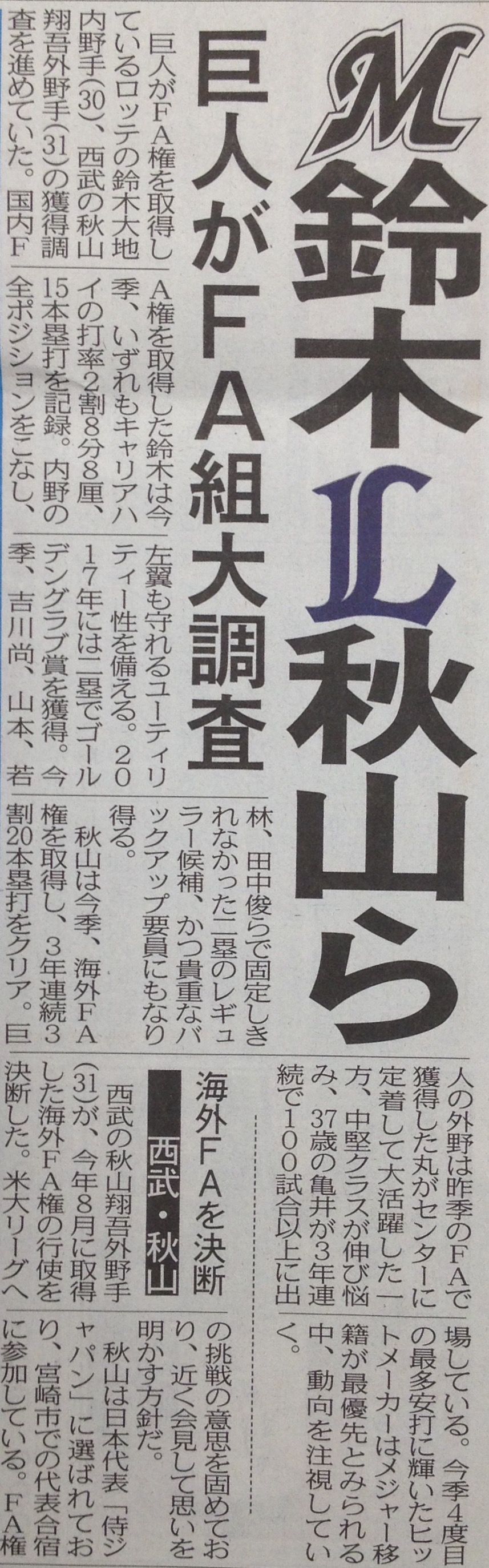鈴木、野村、秋山、美馬、益田の全てに調査報道って近年の巨人だと珍しいのでは?