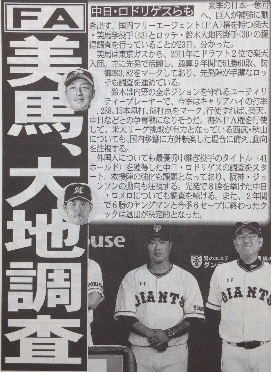 巨人が国内FA権を持つ楽.天・美馬とロッテ・鈴木の獲得調査を行っていることが23日、分かった。