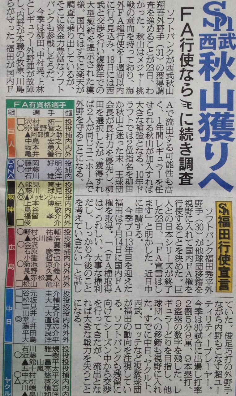 海外FA権を行使して、米大リーグ挑戦が有力となっている西武・秋山についても、