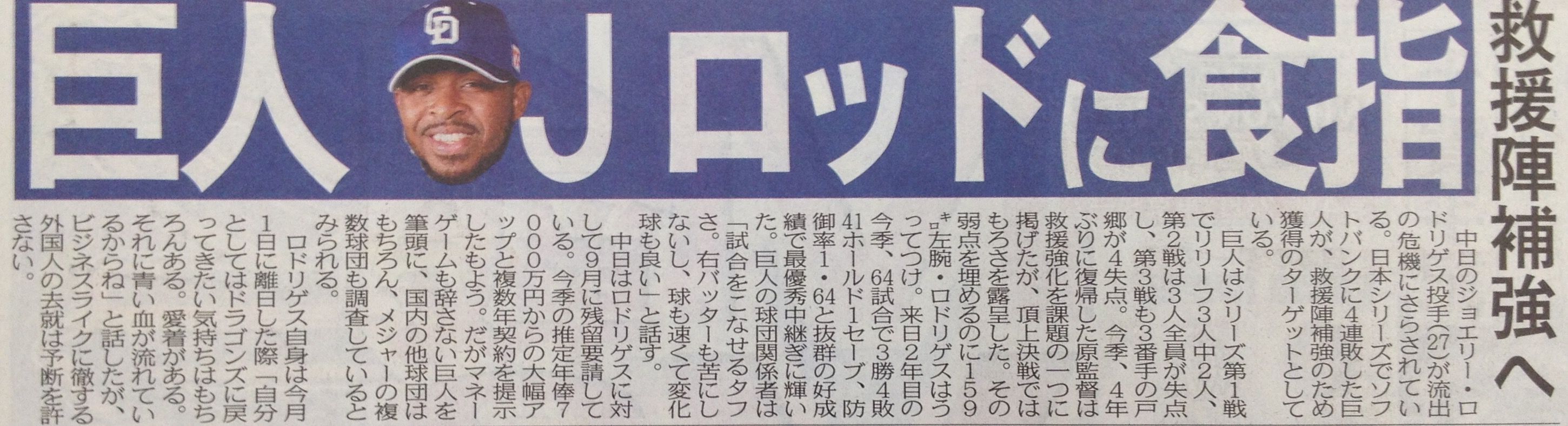 中日・ロドリゲス獲得へ巨人マネーゲーム辞さず…日本シリーズ4連敗 中継ぎもろさ露呈