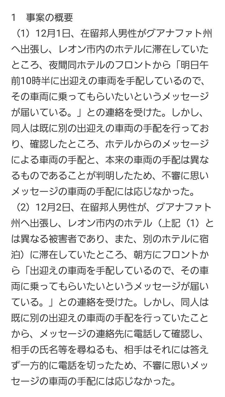 以下の通り、グアナファト州レオン市において邦人出張者が滞在中のホテルにおいて、誘拐を意図した可能性もある不審電話を受けるといった被害が2件発生したことから、注意喚起します。