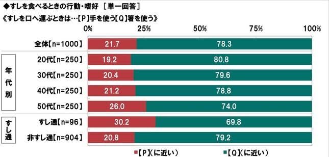 すしを口へ運ぶときはどうするかを聞くと、「手を使う」(21.7%)、「箸を使う」(78.3%)と、箸で食べる人が圧倒的に多かった。