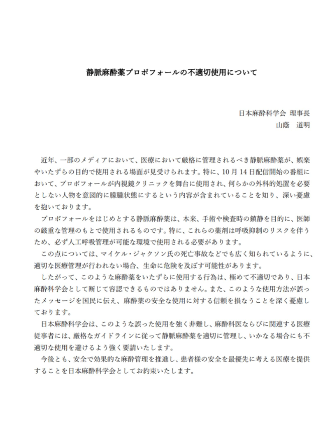 10 ?14?配信開始の番組において、プロポフォールが不適切使用されたことについて、深い憂慮を抱いております。