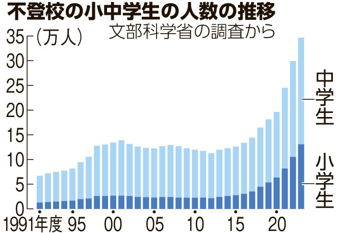 年30日以上登校せず、「不登校」とされた小中学生が、2023年度は過去最多の34万6482人に上ったことが文部科学省の調査でわかった。前年度より4万7434人多く、30万人超は初めて。