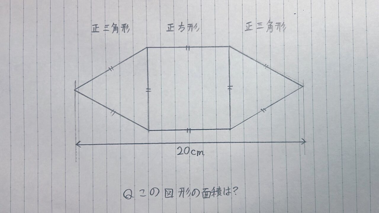 真ん中横に補助線ひいて三角形の位置変えたら一辺10cmの正方形できるやつ